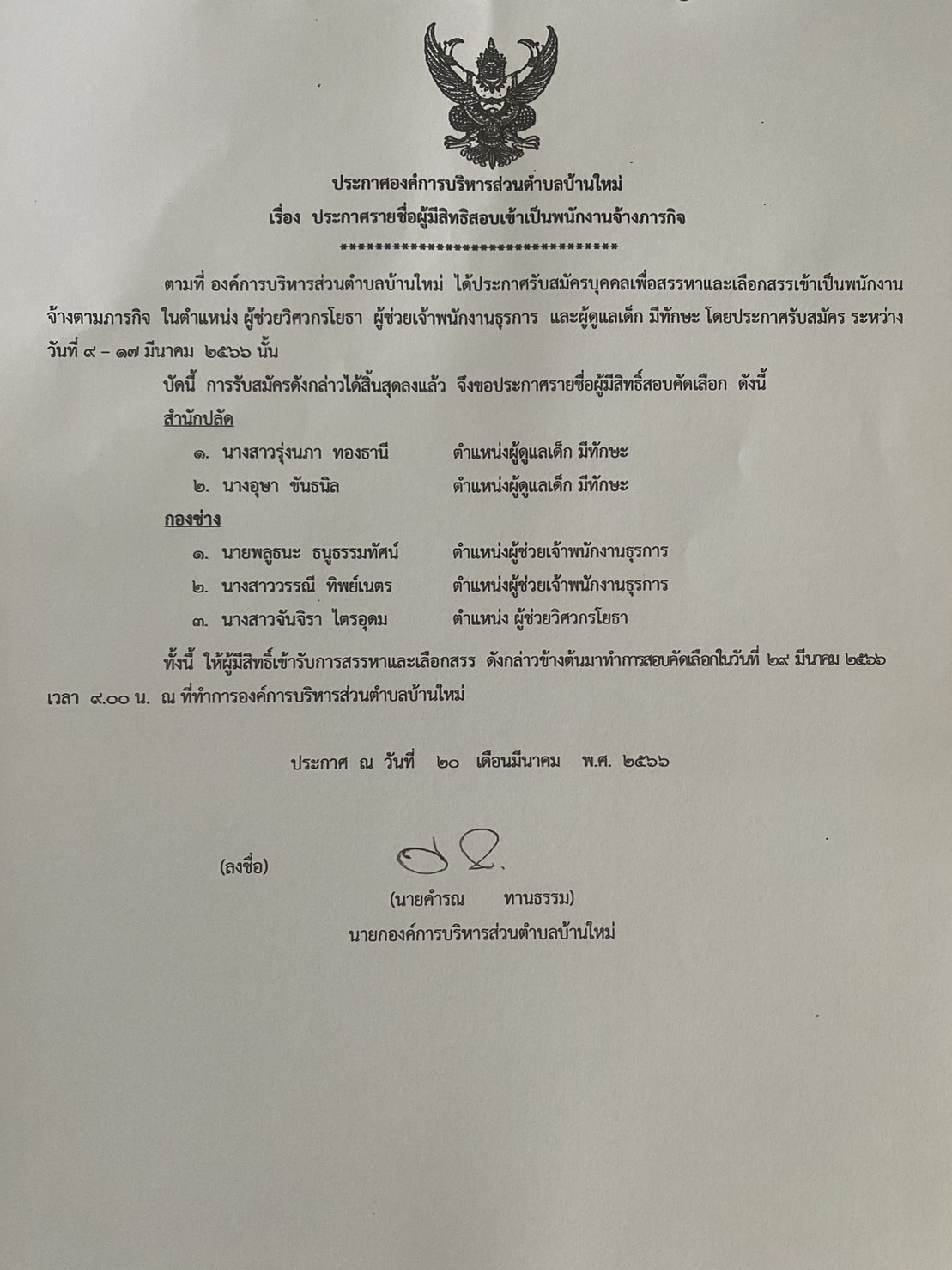 - ประกาศ เรื่อง ประกาศรายชื่อผู้ผ่านการสรรหาและเลือกสรรพนักงานจ้าง ประจำปี พ.ศ.2566